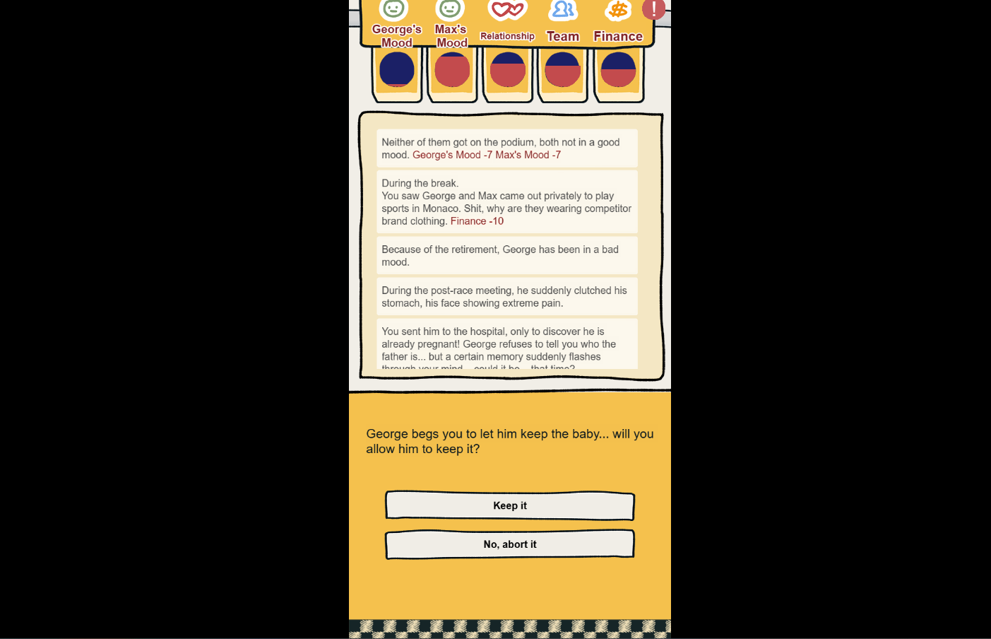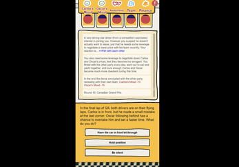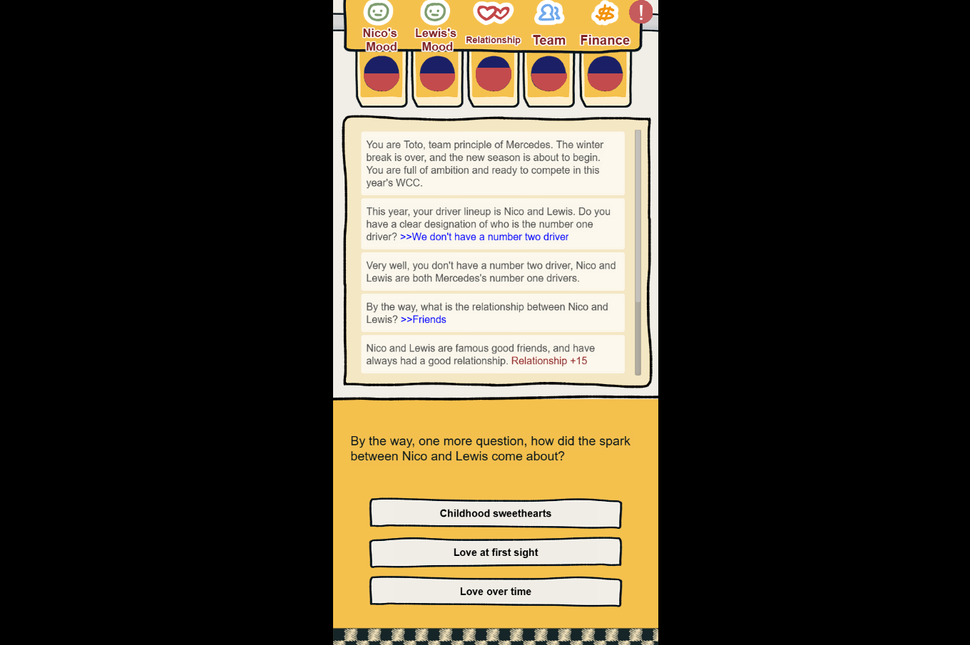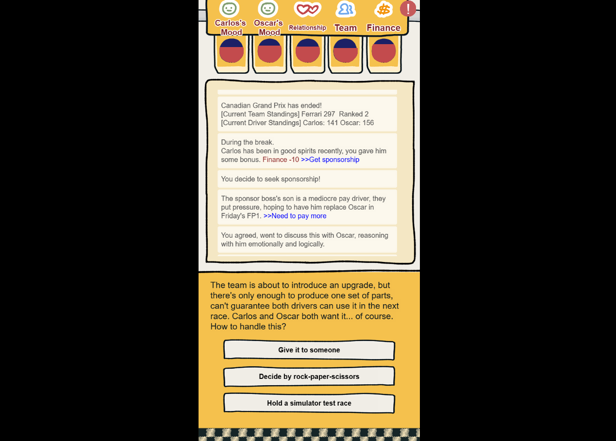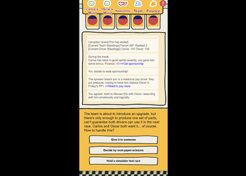 You will play as the team principal of a championship-contending team, balancing the moods and relationships of your drivers throughout the 24-race season! Your goal is to avoid internal conflicts and lead your team to the Constructors' Championship!