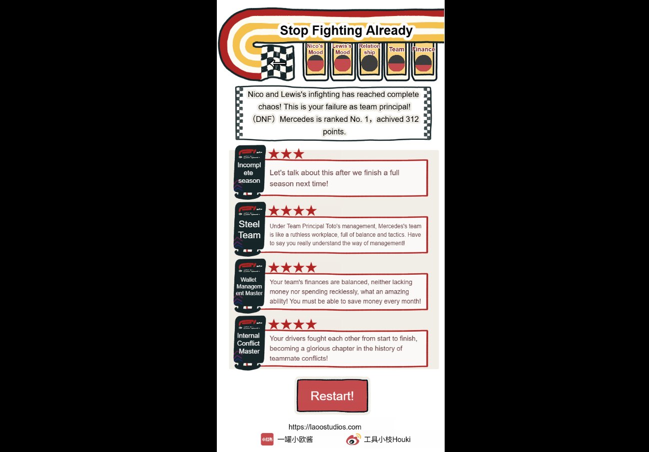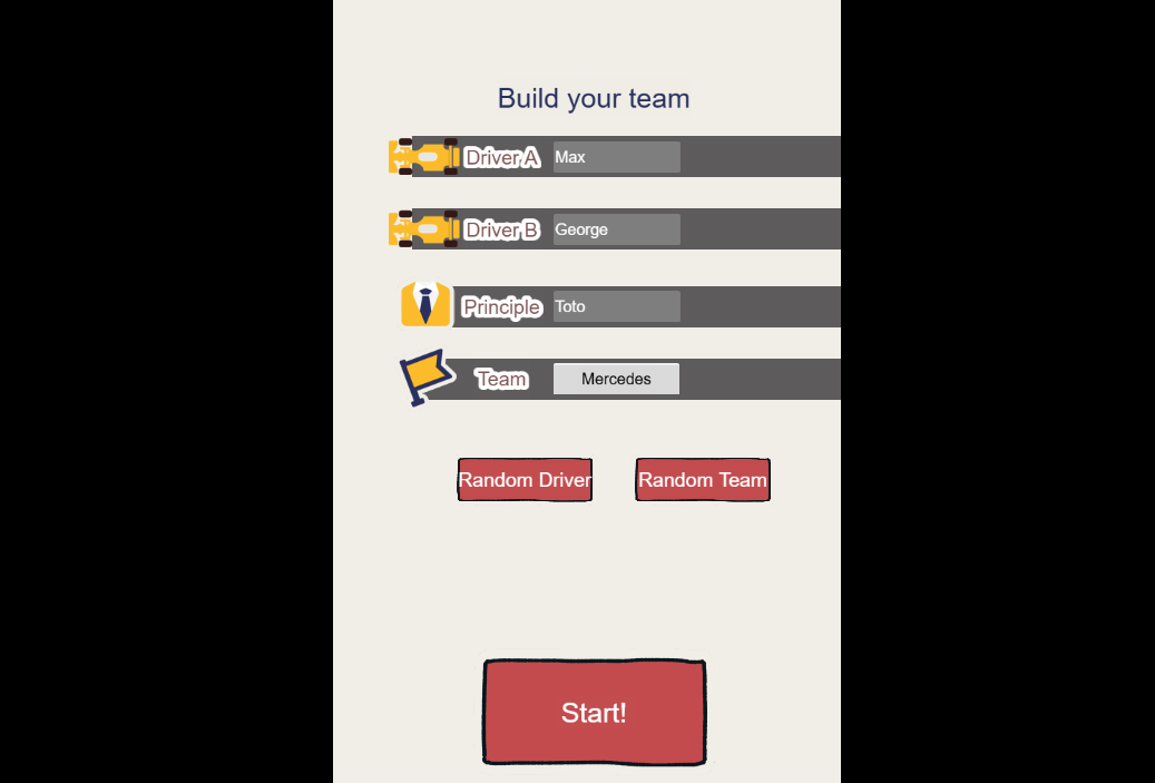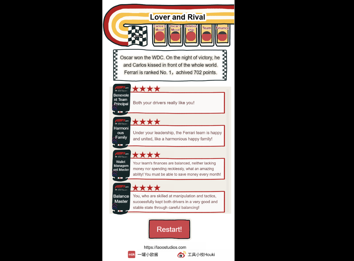 You will play as the team principal of a championship-contending team, balancing the moods and relationships of your drivers throughout the 24-race season! Your goal is to avoid internal conflicts and lead your team to the Constructors' Championship!